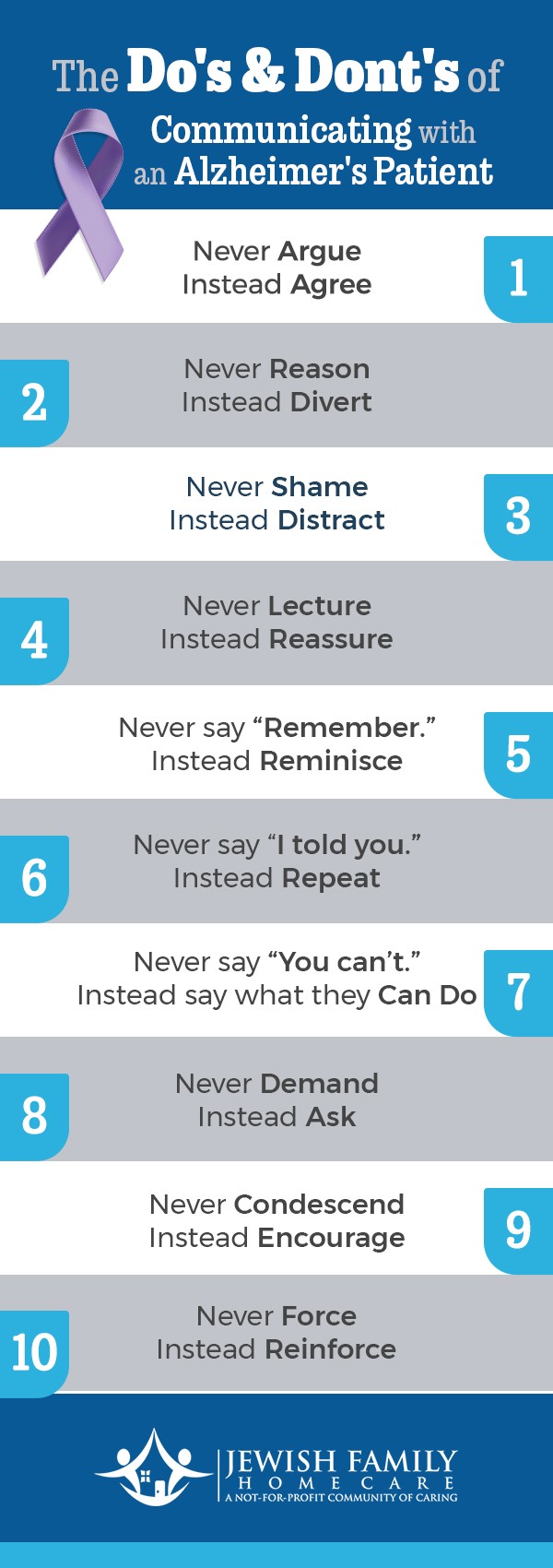 , and check out the recommend guidelines for communicating with someone who has Alzheimer’s disease, for a better understanding and effective, comfortable communication.