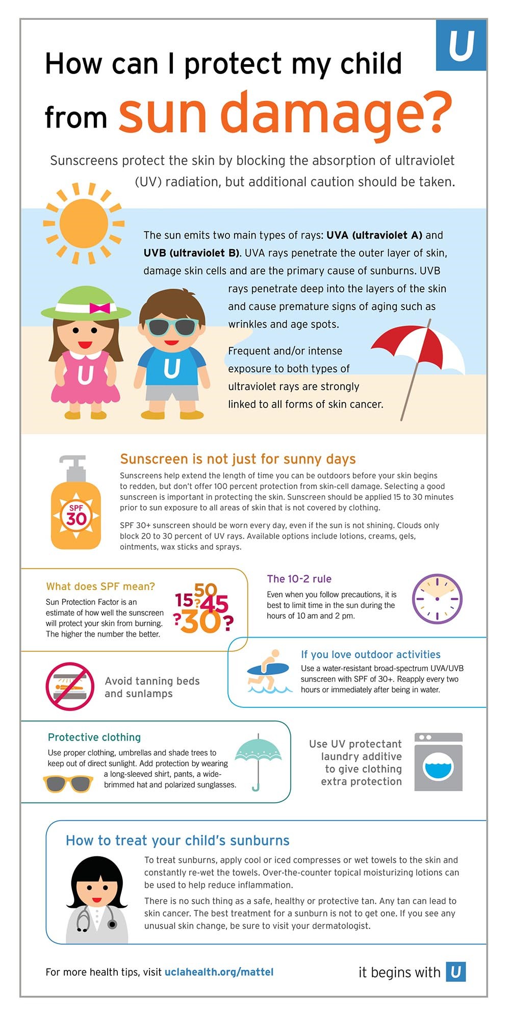 This infographic on “protect your child from sun damage” lets you understand how sunscreens protects the skin by blocking the absorption of ultraviolet (UV) radiation, but additional caution should be taken, how to treat your child’s sunburns, etc.