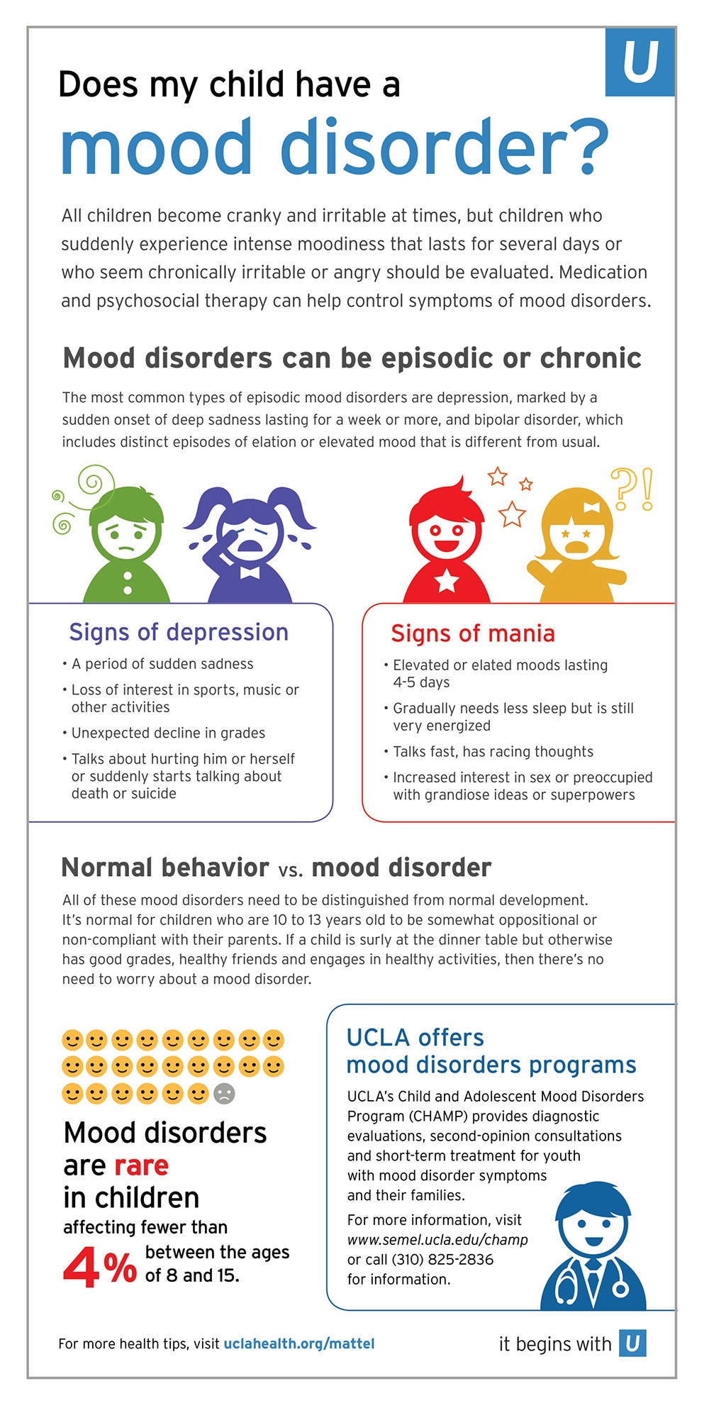 This infographic on “mood disorder in children” lets you understand how all children become cranky and irritable at times, but children who suddenly experience intense moodiness that lasts for several days or who seem chronically irritable or angry should be examined. The infographic also explains how medication and psychosocial therapy can help control symptoms of mood disorders in children.