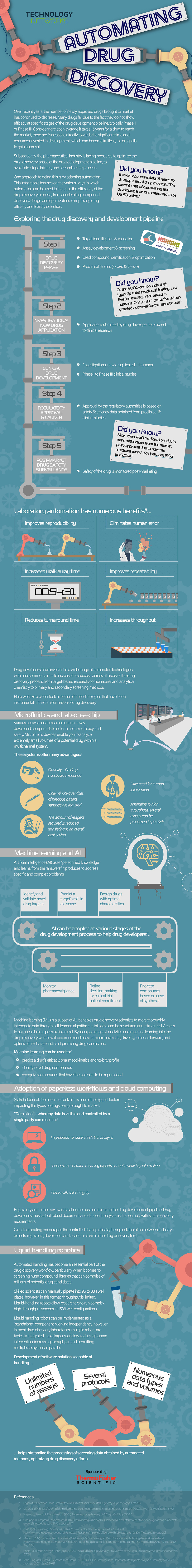 . With the help of this infographic, learn about automatic drug discovery, advantages of automated drug discovery laboratory, microfluidics and lab-on-a-chip technologies, etc. Over recent years, the number of newly approved drugs brought to market has continued to decrease. Many drugs fail due to the fact they do not show efficacy at specific stages of the drug development pipeline, typically Phase II or Phase III. Subsequently, the pharmaceutical industry is facing pressures to optimize the drug discovery phase of the drug development pipeline, to avoid late-stage failures, and streamline the process. One approach to doing this is by adopting automation explained in this infographic.