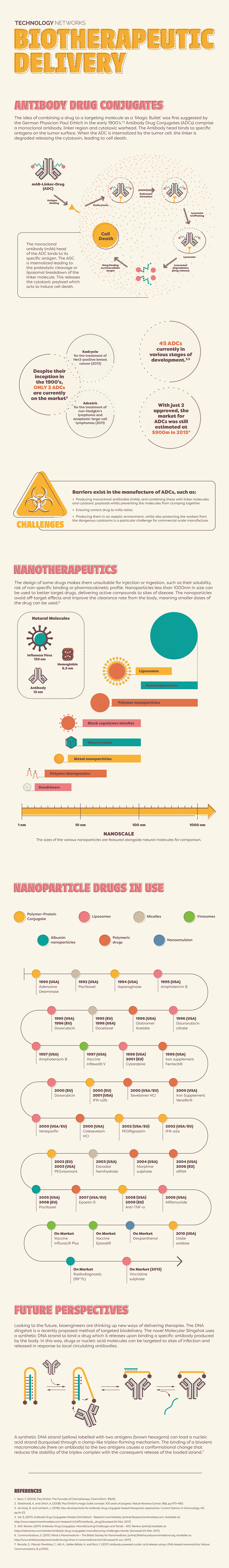 . Download and go through this infographic to learn how antibody drug conjugates target and kill tumor cells, the challenges to antibody drug conjugate commercial-scale manufacture, nanoparticle therapeutics, implementation in modern medicine and a look to the future and the DNA slingshot. The idea of combining a drug to a targeting molecule as a ‘Magic Bullet’ was first suggested by the German Physician Paul Erhlich in the early 1900’s. Antibody Drug Conjugates (ADCs) comprise a monoclonal antibody, linker region and cytotoxic warhead. The Antibody head binds to specific antigens on the tumor surface. When the ADC is internalized by the tumor cell, the linker is degraded releasing the cytotoxin, leading to cell death.