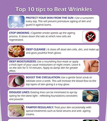 . Download and go through this infographic and check out Top 10 tips to beat wrinkles in an easy and natural way. Learn how to delay aging by with the help of younger skin with these tips.