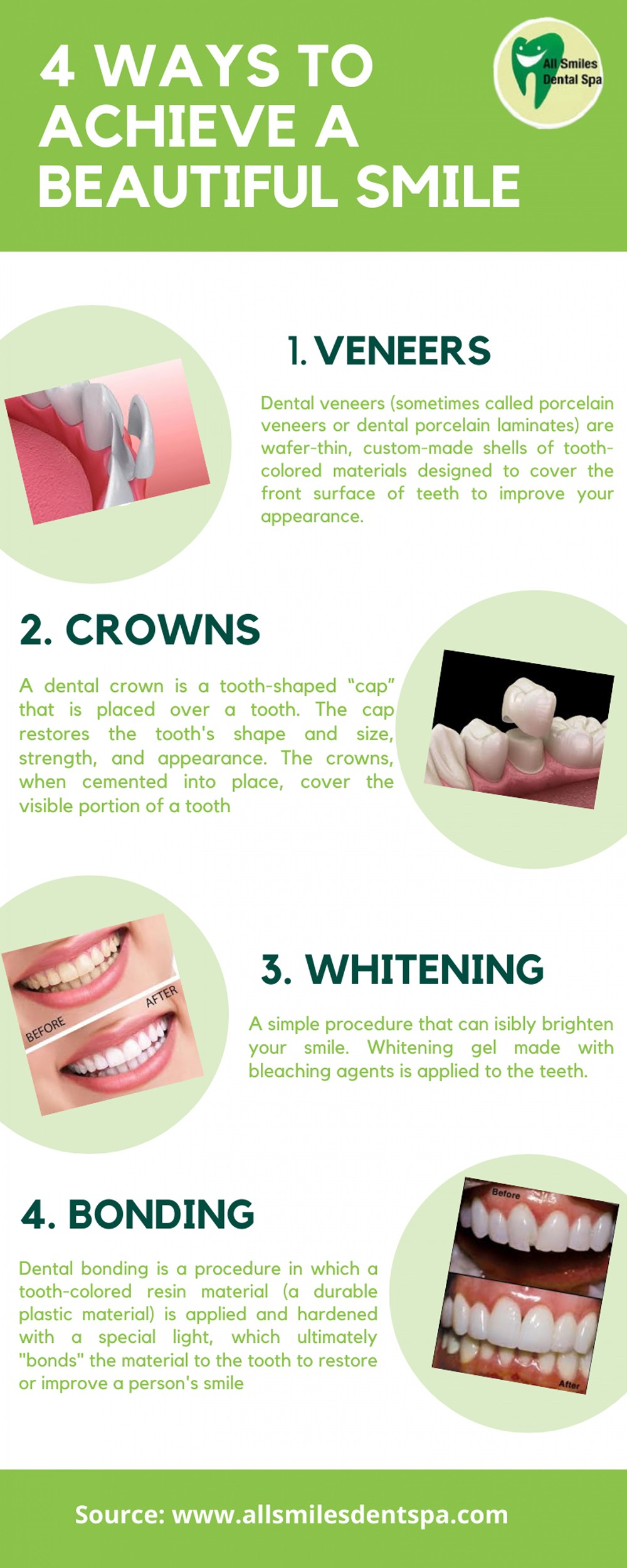 . This infographic lists 4 ways to achieve a beautiful smile, namely the veneers, crowns, bonding, and teeth whitening procedure.