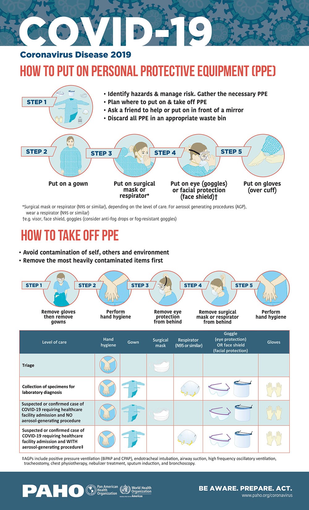 This infographic by the World Health Organization (WHO) will let you know how to put on and take off PPE (personal protective equipment) in a correct way.