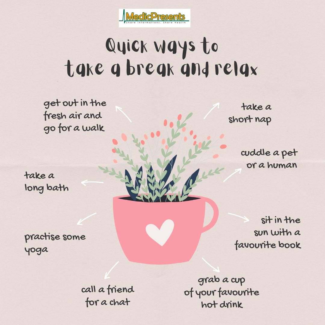 Discover quick and effective ways to take a break and relax with our latest infographic titled "Quick ways to take a break and relax". Learn simple tips and techniques to instantly calm your mind and body, even on the busiest days. From deep breathing exercises to short walks and mindfulness practices, find out how to incorporate these easy relaxation methods into your daily routine. Achieve instant stress relief and improve your well-being with these quick relaxation tips.