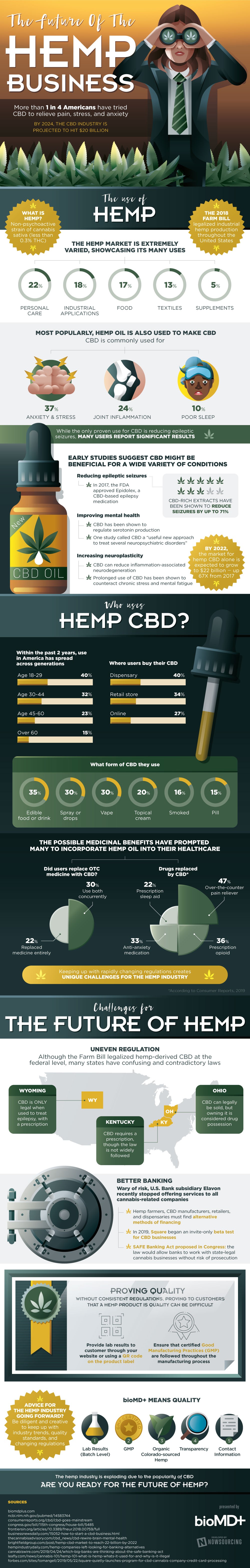 Download and check “The Future Of The Business Of Hemp” Infographic developed by BioMD+, and learn how more than 1 in 4 American citizen has tried CBD to relieve pain, stress, and anxiety and how this business of hemp is growing.