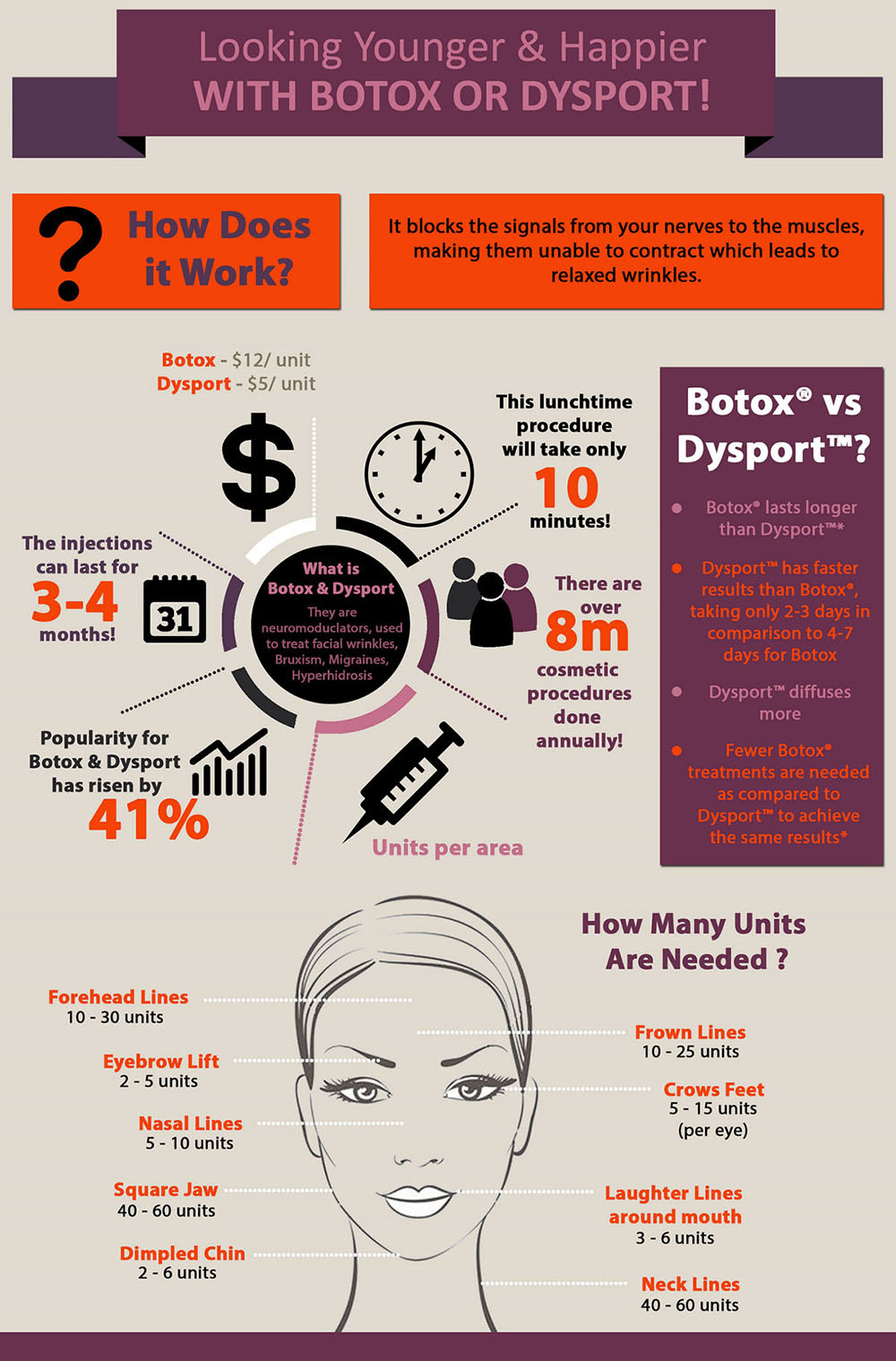 Download and check, “Looking Younger & Healthier With Botox or Dysport” Infographic developed by calgarysurgery.com, and know how Botox and Dysport are best solutions for medical conditions like Bruxism, migraines, hyperhidrosis. Botox and Dysport can also help you look younger.