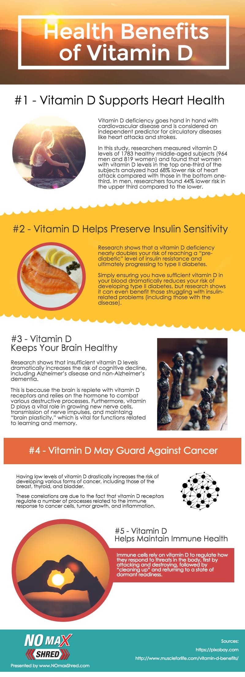 Download and check, “Health Benefits of Vitamin D” Infographic presented by nomaxshred.com, and learn the health benefits of vitamin D like healthy brain, cancer prevention, etc.