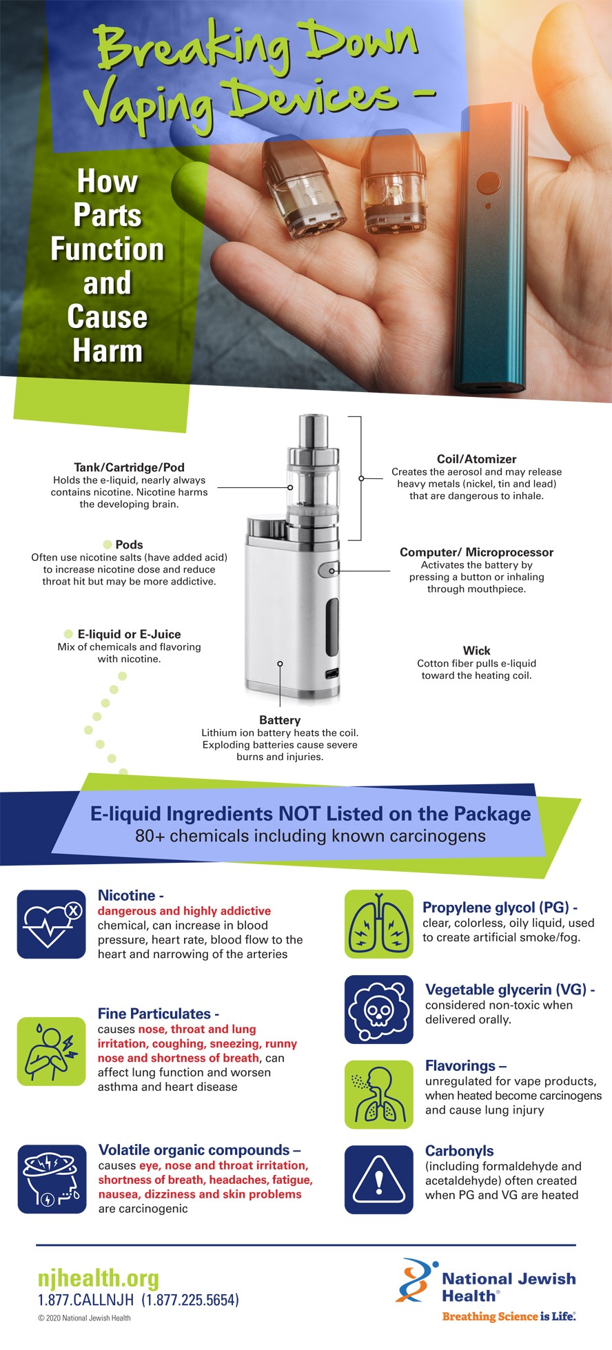 Download and check, “Breaking Down Vaping Devices” Infographic by nationaljewish.org, and learn how different parts of a vaping device functions and causes harm.
